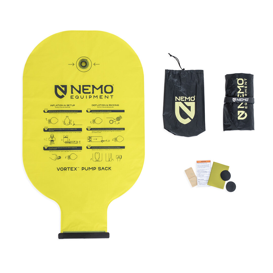隨附的Vortex泵袋可輕鬆快速地充氣,在高海拔時節省呼吸,並最大限度地減少進入墊子的水分。