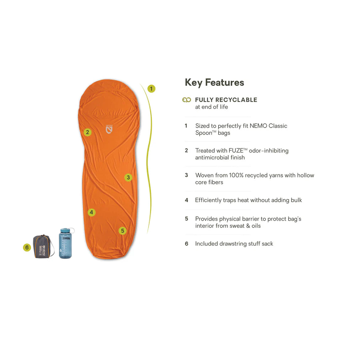 舒適貼合版型:採用與 Nemo Ultralight Spoon™ 睡袋輪廓相匹配的版型,確保能緊密貼合睡袋內部,提供舒適且高效的睡眠體驗,無需任何扣件。